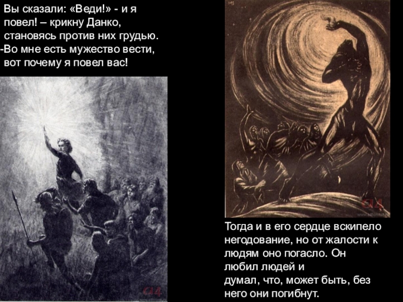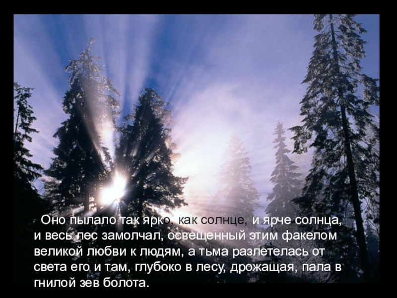 Оно пылало так ярко, как солнце, и ярче солнца, и весь лес замолчал, освещенный этим факелом великой любви к людям, а тьма разлетелась от света его и там, глубоко в лесу, дрожащая, пала в гнилой зев болота.