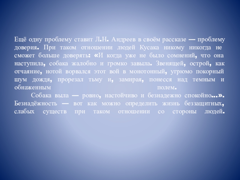 доверия. При таком отношении людей Кусака никому никогда не сможет больше доверять: «И когда уже не было сомнений, что она наступила, собака жалобно и громко завыла. Звенящей, острой, как отчаяние, нотой ворвался этот вой в монотонный, угрюмо покорный шум дождя, прорезал тьму и, замирая, понесся над темным и обнаженным полем.