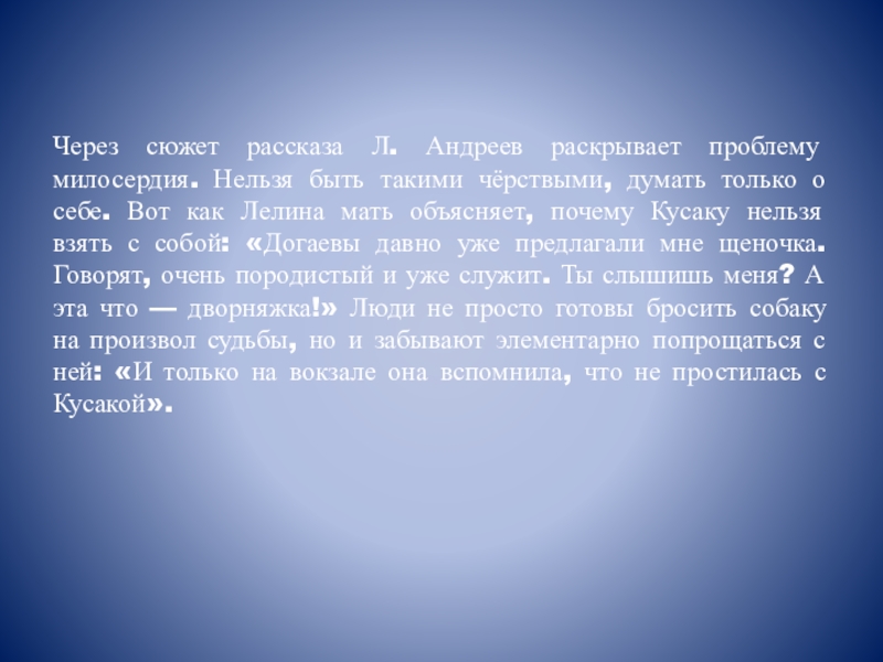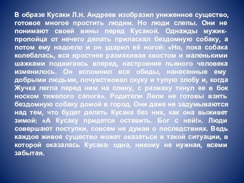 людям. Но люди слепы. Они не понимают своей вины перед Кусакой. Однажды мужик- пропойца от нечего делать приласкал бездомную собаку, а потом ему надоело и он ударил её ногой: «Но, пока собака колебалась, все яростнее размахивая хвостом и маленькими шажками подвигаясь вперед, настроение пьяного человека изменилось. Он вспомнил все обиды, нанесенные ему добрыми людьми, почувствовал скуку и тупую злобу и, когда Жучка легла перед ним на спину, с размаху ткнул ее в бок носком тяжелого сапога». Родители Лели не готовы взять бездомную собаку домой в город. Они даже не задумываются над тем, что будет делать Кусака без них, как она выживет зимой: «А Кусаку придется оставить. Бог с ней!». Люди совершают поступки, совсем не думая о последствиях. Ведь каждое живое существо может оказаться в такой ситуации, в которой оказалась Кусака: одна, никому не нужная, всеми забытая.