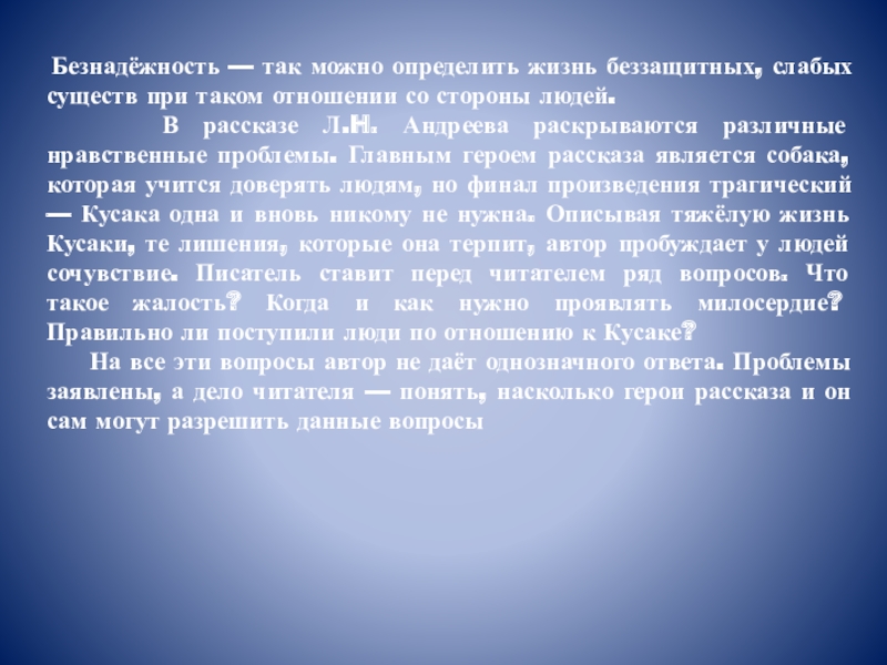 Слайд 1Нравственные проблемы в рассказе Л. Андреева «Кусака»