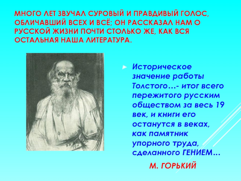 Историческое значение работы Толстого…- итог всего пережитого русским обществом за весь 19 век, и книги его останутся в веках, как памятник упорного труда, сделанного ГЕНИЕМ…