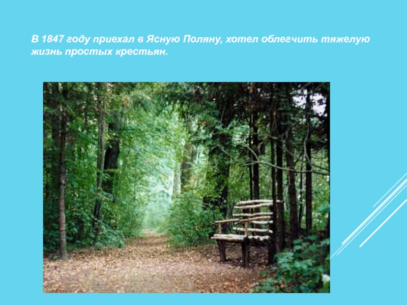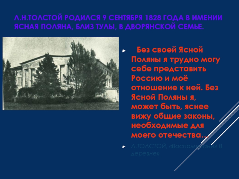 Без своей Ясной Поляны я трудно могу себе представить Россию и моё отношение к ней. Без Ясной Поляны я, может быть, яснее вижу общие законы, необходимые для моего отечества…