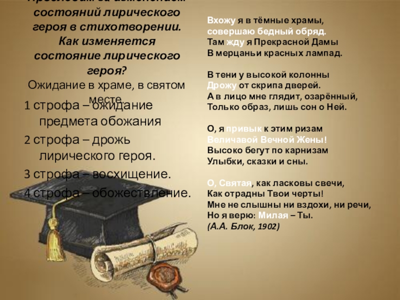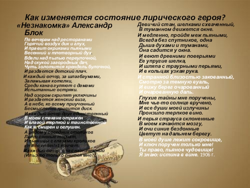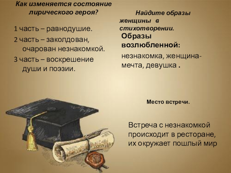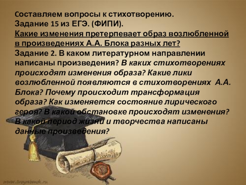 Задание 2. В каком литературном направлении написаны произведения? В каких стихотворениях происходят изменения образа? Какие лики возлюбленной появляются в стихотворениях А.А.Блока? Почему происходит трансформация образа? Как изменяется состояние лирического героя? В какой обстановке происходят изменения? В какой период жизни и творчества написаны данные произведения?