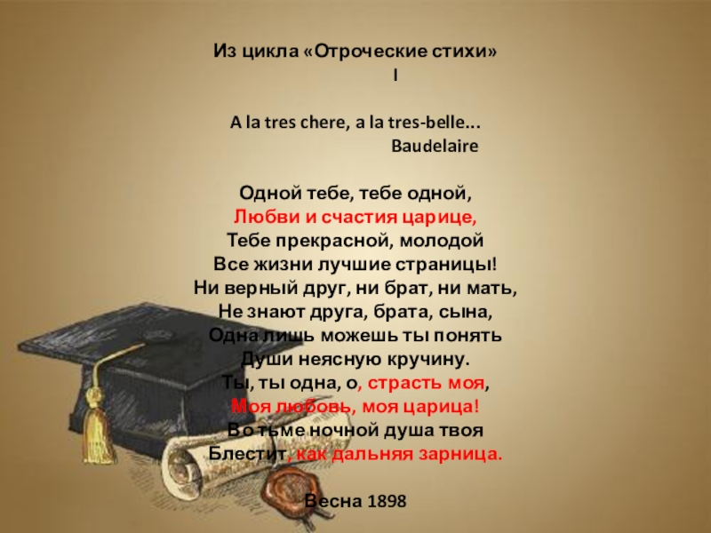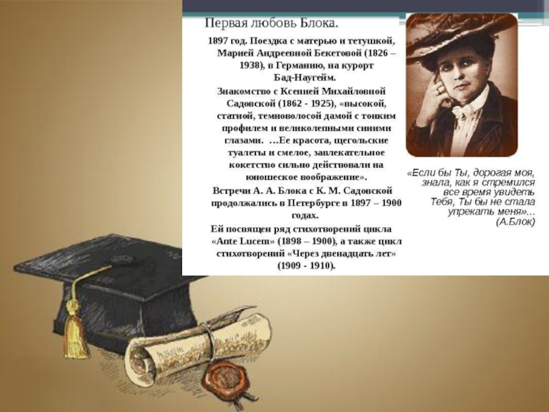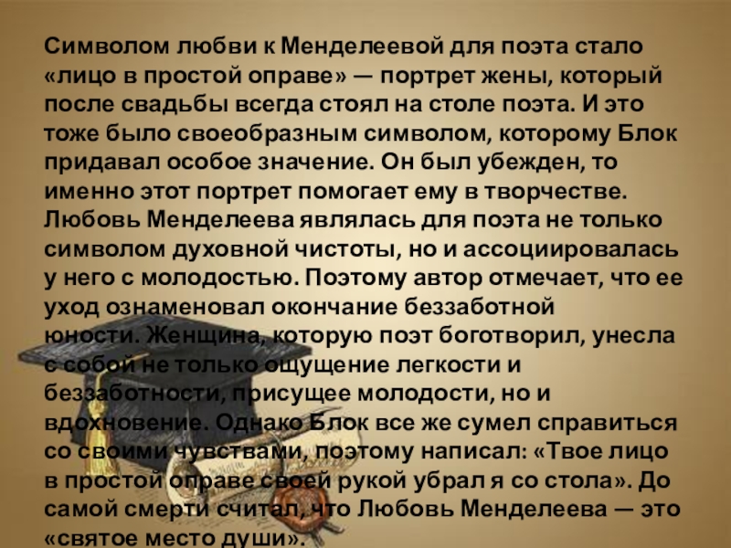хотя это далеко не основной мотив его творчества. Творческая судьба поэта всегда была неразрывно связана с его личной жизнью. Через всю жизнь он пронес чувство безграничной любви к Л. Д. Менделеевой. Это она вдохновила его на те стихотворения, которые позже вошли в сборник “Стихи о Прекрасной Даме”. Это был первый поэтический сборник Блока.