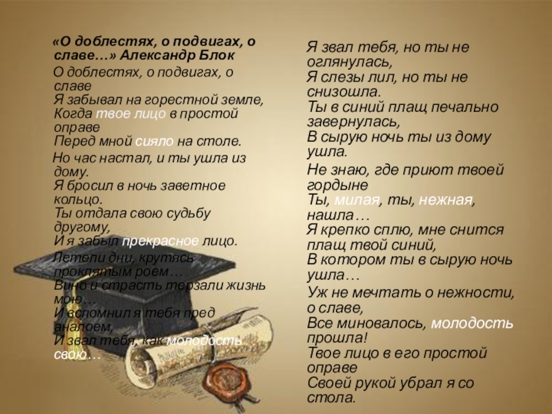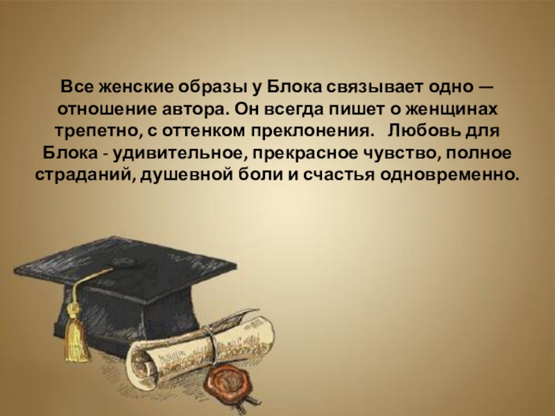 всегда пишет о женщинах трепетно, с оттенком преклонения. Любовь для Блока - удивительное, прекрасное чувство, полное страданий, душевной боли и счастья одновременно.