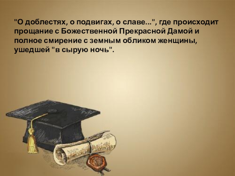 Несмотря на то что она имела вполне земной прототип, Прекрасная Дама обожествлялась Блоком, приравнивалась к святой. Она кажется эфемерным существом, созданным из какой-то высшей субстанции, не из плоти. Это идеал, символ Вечной Женственности. Вообще, женщина в лирике Блока занимает особое место. Женский образ у поэта всегда символичен и не похож ни на одну реально существовавшую женщину. В цикле «Стихи о Прекрасной Даме» образ возлюбленной идеализирован. Перед нами предстает не настоящий человек, а «милый образ, нежный сон».