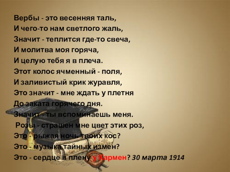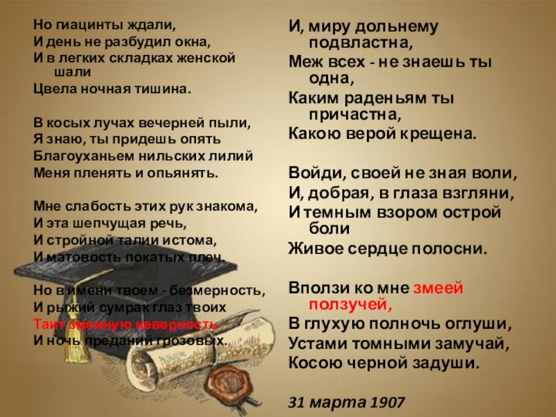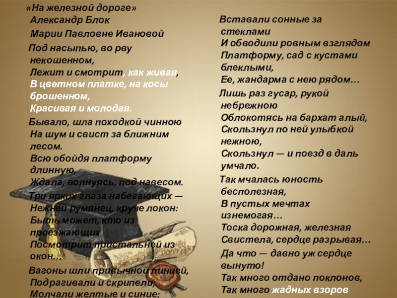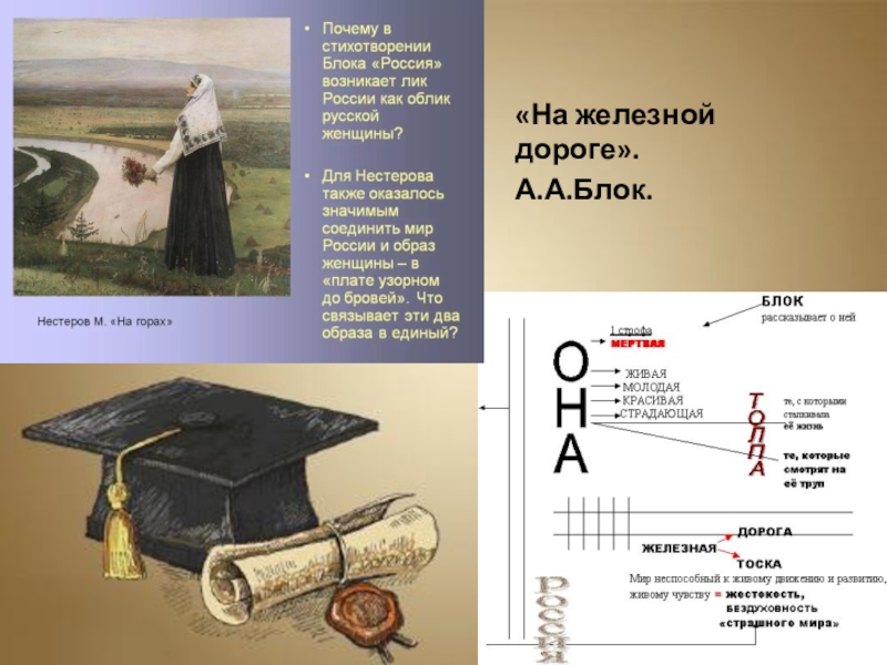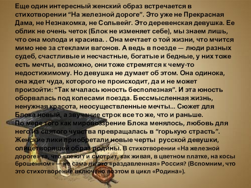 По мере того как мировоззрение Блока менялось, любовь для него из святого чувства превращалась в “горькую страсть”. Женские лики приобретали новые черты русской девушки, олицетворящей образ родины. В стихотворении «На железной дороге» та, что «лежит и смотрит, как живая, в цветном платке, на косы брошенном» — не сама ли это «раздавленная» Россия? (Вспомним, что это стихотворение включено поэтом в цикл «Родина»).