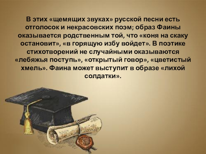 Слайд 27В этих «щемящих звуках» русской песни есть отголосок и некрасовских поэм;