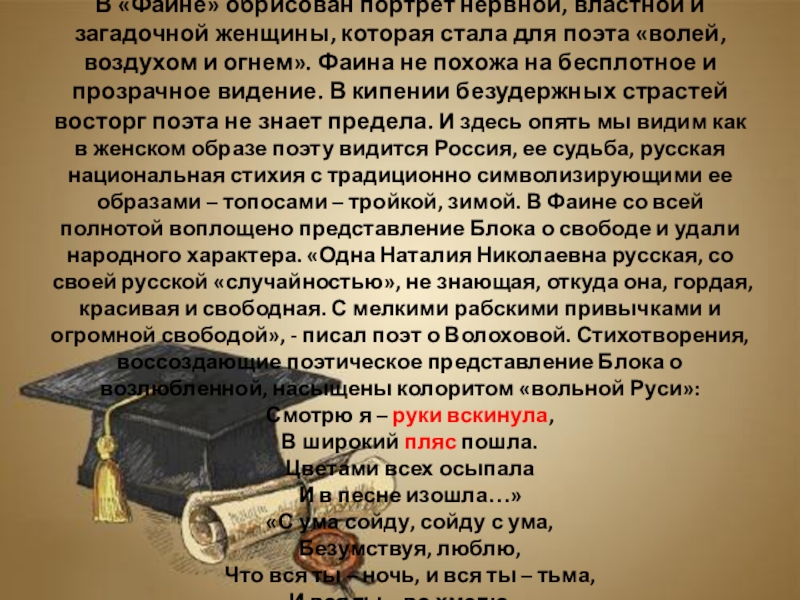 образ Фаины оказывается родственным той, что «коня на скаку остановит», «в горящую избу войдет». В поэтике стихотворений не случайными оказываются «лебяжья поступь», «открытый говор», «цветистый хмель». Фаина может выступит в образе «лихой солдатки».