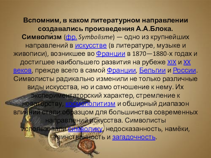 Слайд 11Вспомним, в каком литературном направлении создавались произведения А.А.Блока.