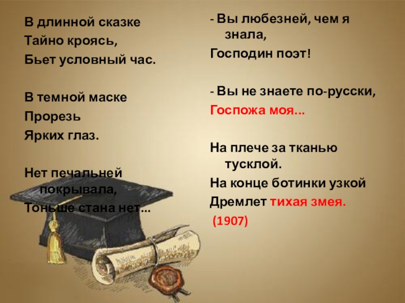 Это уже не Прекрасная Дама, не Незнакомка, не Сольвейг. Это деревенская девушка. Ее облик не очень четок (Блок не изменяет себе), мы знаем лишь, что она молода и красива. . Она мечтает о той жизни, что мчится мимо нее за стеклами вагонов. А ведь в поезде — люди разных судеб, счастливые и несчастные, богатые и бедные, у них тоже есть мечты, возможно, они тоже стремятся к чему-то недостижимому. Но девушка не думает об этом. Она одинока, она ждет чуда, которого не происходит, да и не может произойти: “Так мчалась юность бесполезная”. И эта юность оборвалась под колесами поезда. Бессмысленная жизнь, ненужная красота, неосуществленные мечты... Сюжет для Блока новый, а звучание строк все то же, что и раньше.