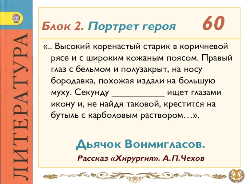 и с широким кожаным поясом. Правый глаз с бельмом и полузакрыт, на носу бородавка, похожая издали на большую муху. Секунду __________ ищет глазами икону и, не найдя таковой, крестится на бутыль с карболовым раствором…».