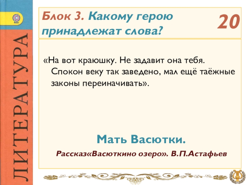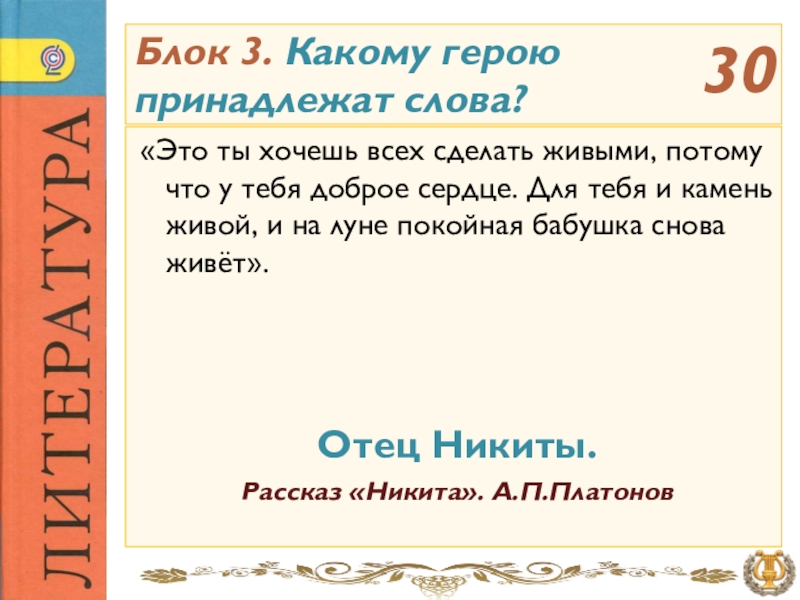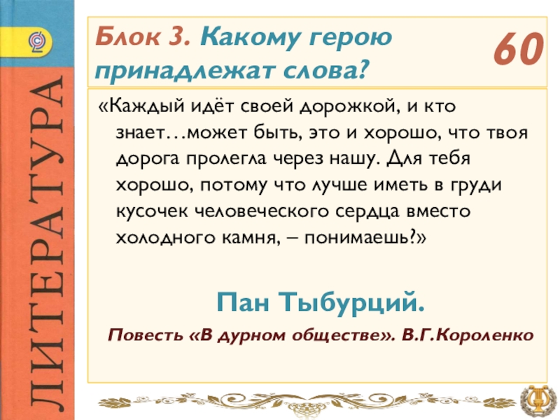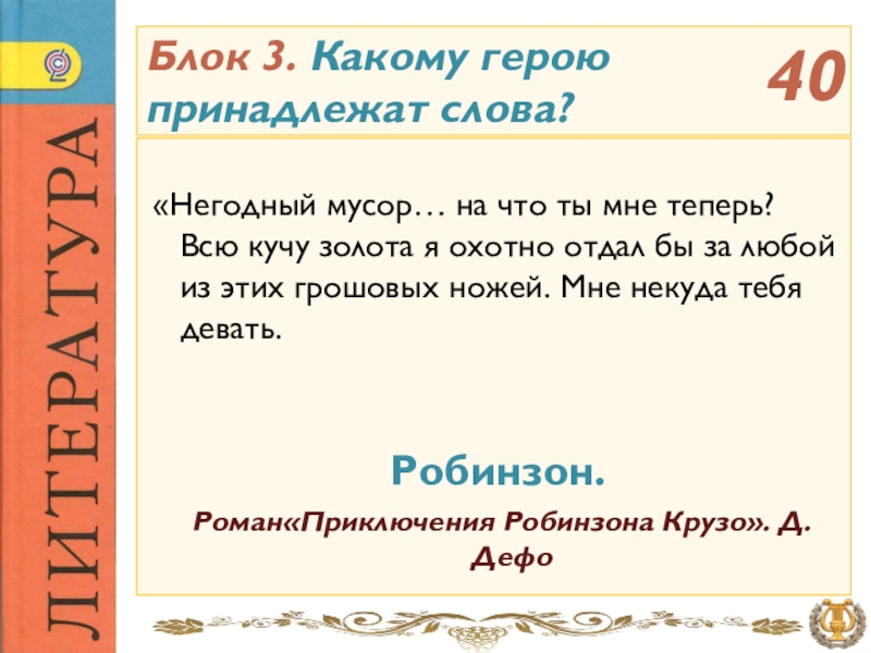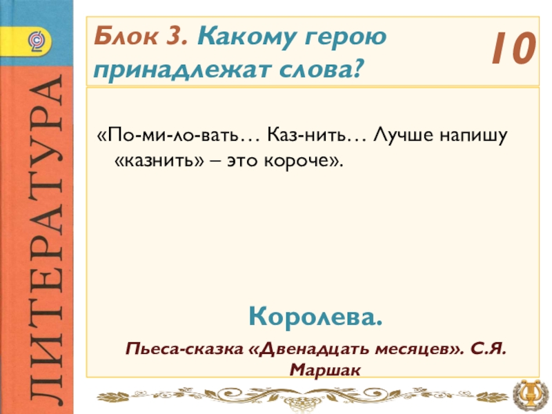 Слайд 17Блок 3. Какому герою принадлежат слова?