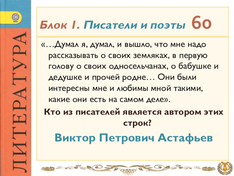 мне надо рассказывать о своих земляках, в первую голову о своих односельчанах, о бабушке и дедушке и прочей родне… Они были интересны мне и любимы мной такими, какие они есть на самом деле».