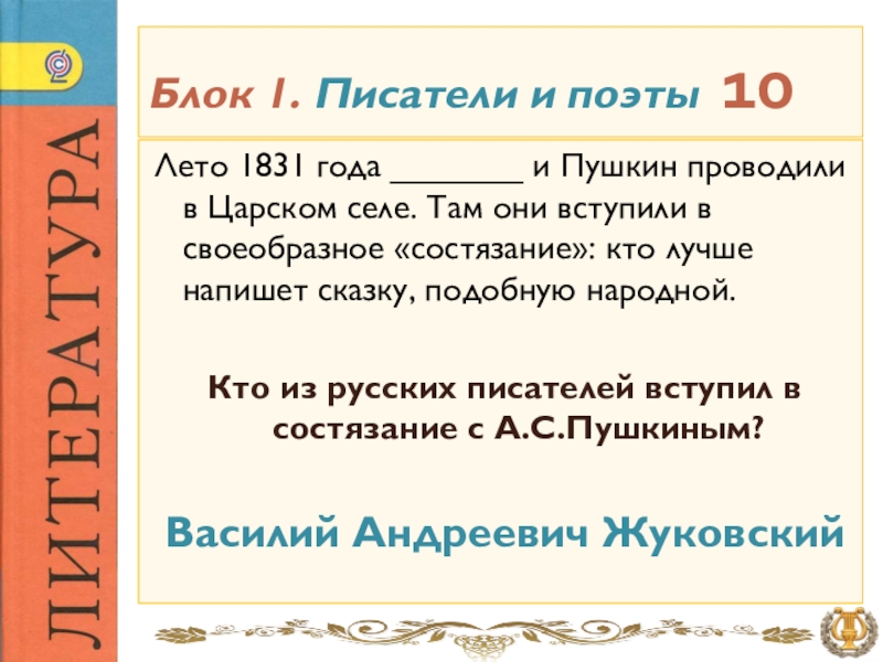 проводили в Царском селе. Там они вступили в своеобразное «состязание»: кто лучше напишет сказку, подобную народной.