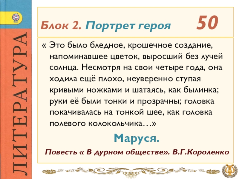 цветок, выросший без лучей солнца. Несмотря на свои четыре года, она ходила ещё плохо, неуверенно ступая кривыми ножками и шатаясь, как былинка; руки её были тонки и прозрачны; головка покачивалась на тонкой шее, как головка полевого колокольчика…»