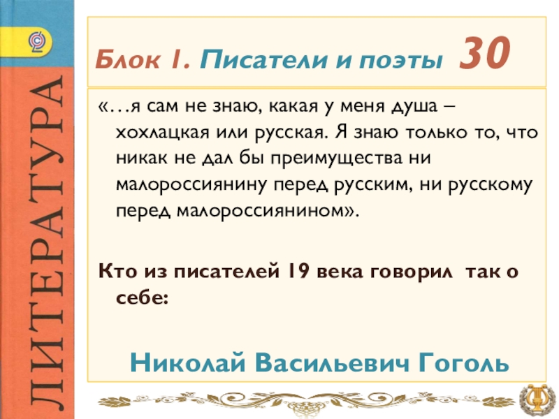 меня душа – хохлацкая или русская. Я знаю только то, что никак не дал бы преимущества ни малороссиянину перед русским, ни русскому перед малороссиянином».