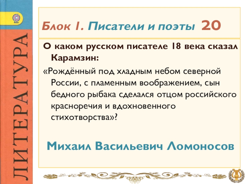 «Рождённый под хладным небом северной России, с пламенным воображением, сын бедного рыбака сделался отцом российского красноречия и вдохновенного стихотворства»?