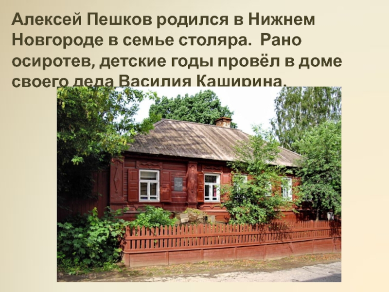 Слайд 4Алексей Пешков родился в Нижнем Новгороде в семье столяра. Рано осиротев,