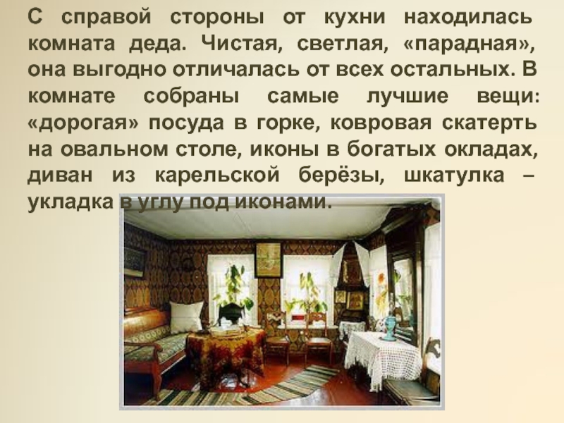 Слайд 15С справой стороны от кухни находилась комната деда. Чистая, светлая, «парадная»,