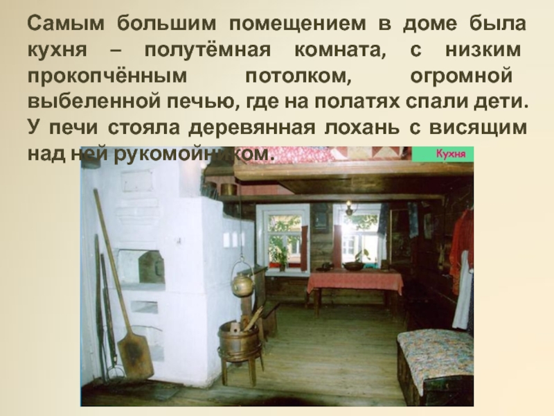 Слайд 11Самым большим помещением в доме была кухня – полутёмная комната, с