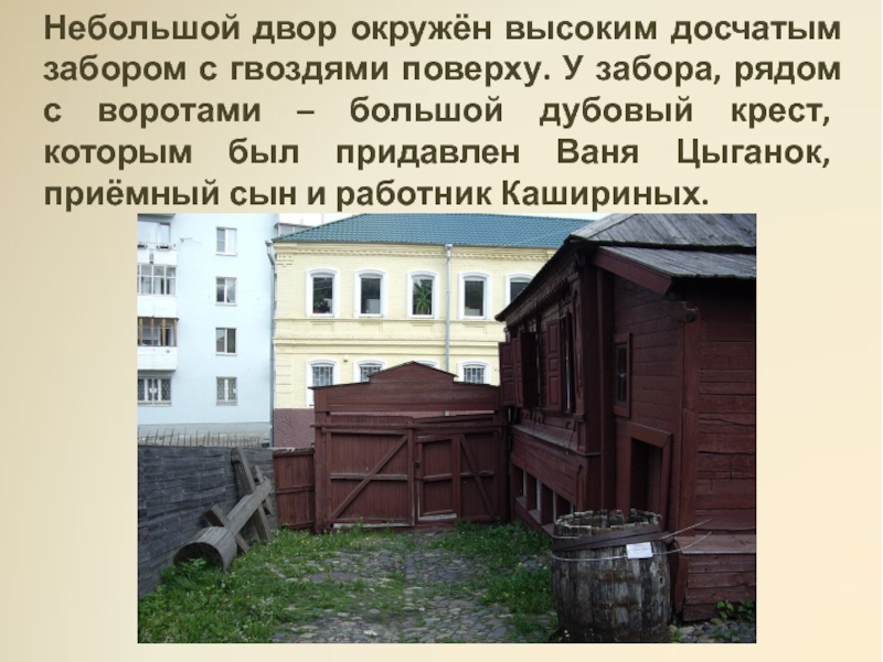 Слайд 5Небольшой двор окружён высоким досчатым забором с гвоздями поверху. У забора,