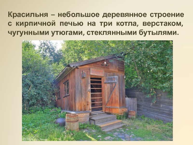 Слайд 6Красильня – небольшое деревянное строение с кирпичной печью на три котла,