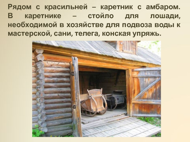 Слайд 8Рядом с красильней – каретник с амбаром.