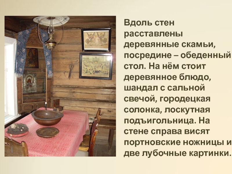 Слайд 12Вдоль стен расставлены деревянные скамьи, посредине – обеденный стол. На нём
