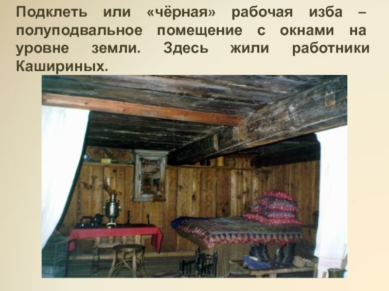 Слайд 10Подклеть или «чёрная» рабочая изба – полуподвальное помещение с окнами на