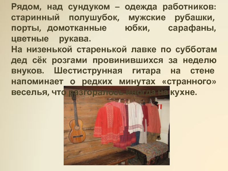 Слайд 13Рядом, над сундуком – одежда работников: старинный полушубок, мужские рубашки, порты,