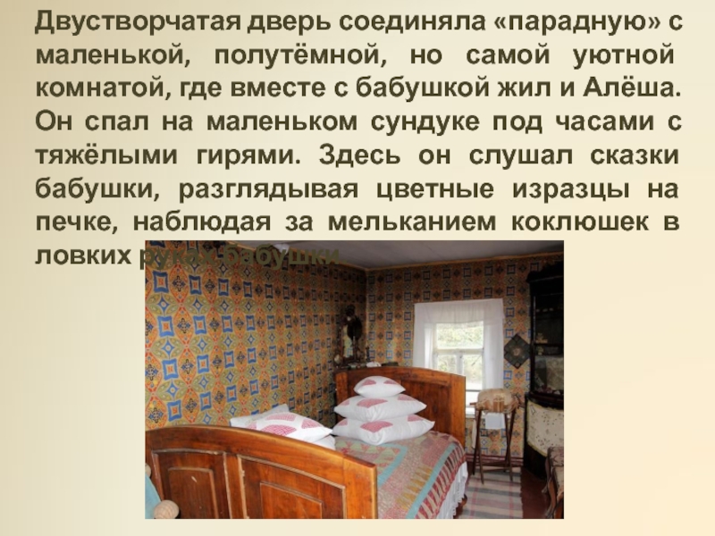 где вместе с бабушкой жил и Алёша. Он спал на маленьком сундуке под часами с тяжёлыми гирями. Здесь он слушал сказки бабушки, разглядывая цветные изразцы на печке, наблюдая за мельканием коклюшек в ловких руках бабушки.