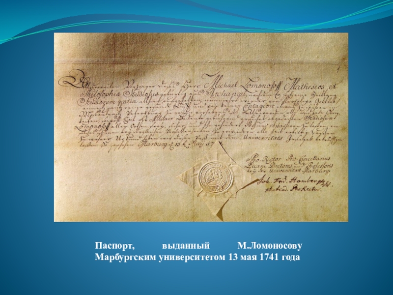 Паспорт, выданный М.Ломоносову Марбургским университетом 13 мая 1741 года
