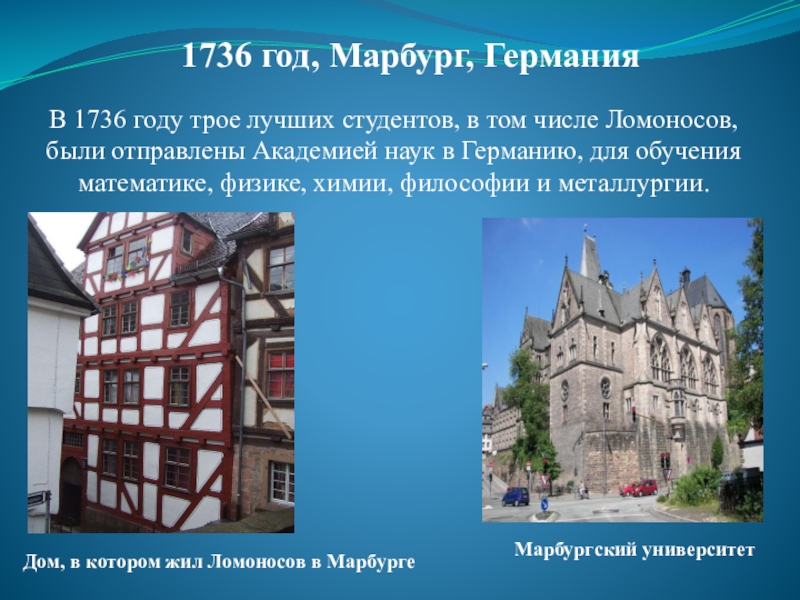 В 1736 году трое лучших студентов, в том числе Ломоносов, были отправлены Академией наук в Германию, для обучения математике, физике, химии, философии и металлургии.