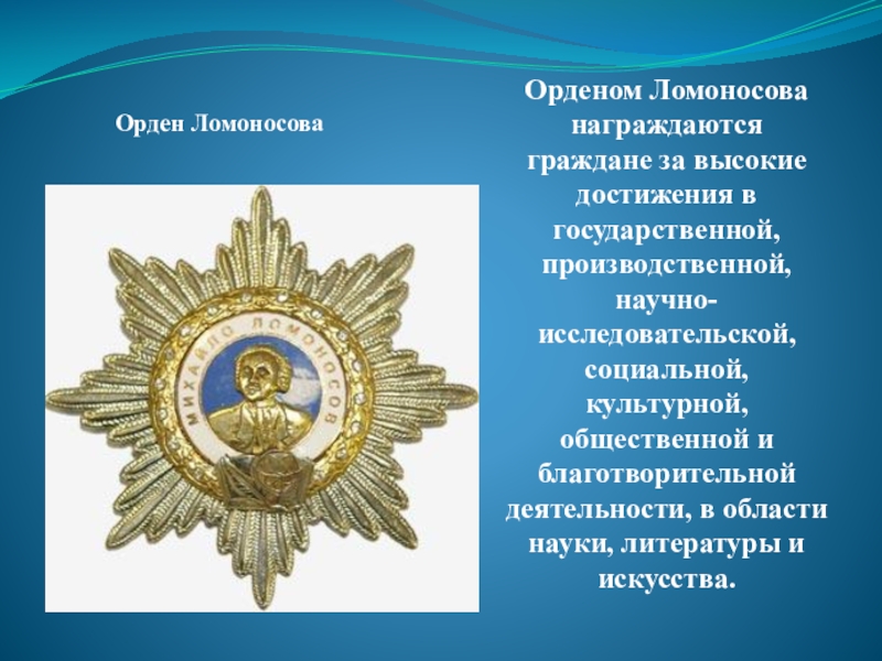 достижения в государственной, производственной, научно-исследовательской, социальной, культурной, общественной и благотворительной деятельности, в области науки, литературы и искусства.