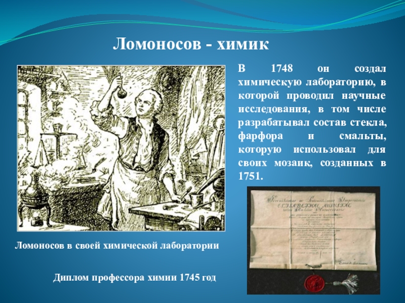В своей Химической лаборатории Ломоносов занимался опытами по производству