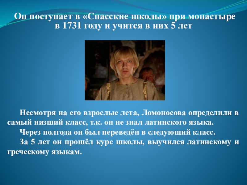 За 5 лет он прошёл курс школы, выучился латинскому и греческому языкам.