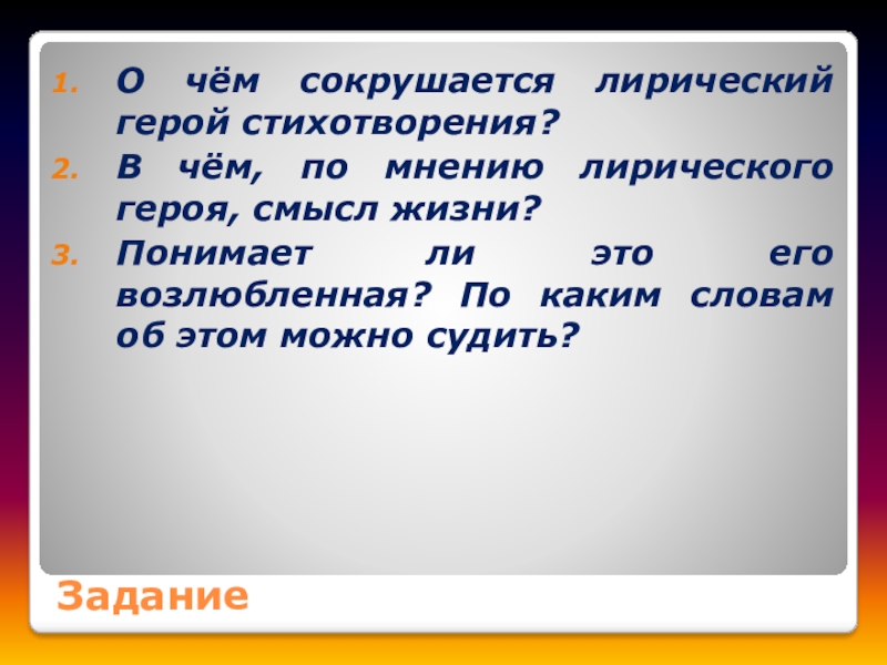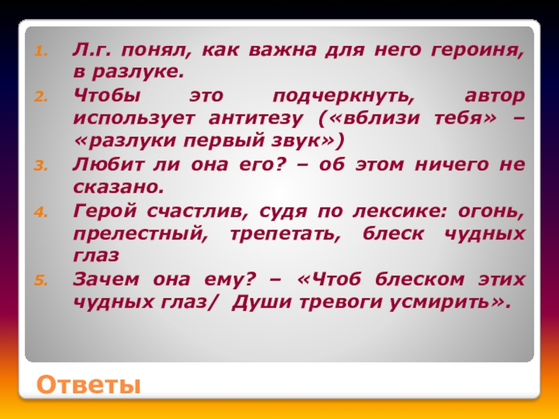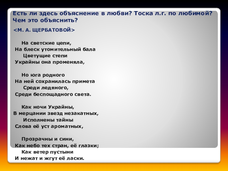 Слайд 32Есть ли здесь объяснение в любви? Тоска л.г. по любимой? Чем