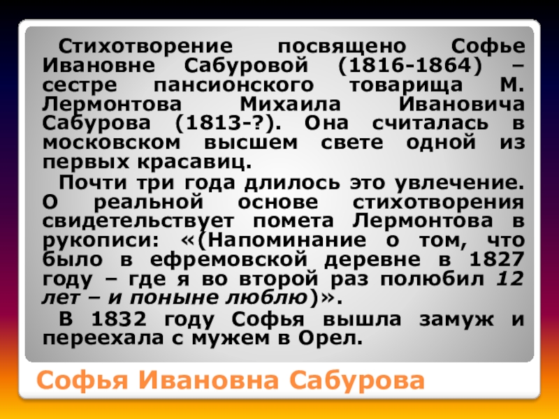 Стихотворение посвящено Софье Ивановне Сабуровой (1816-1864) – сестре пансионского