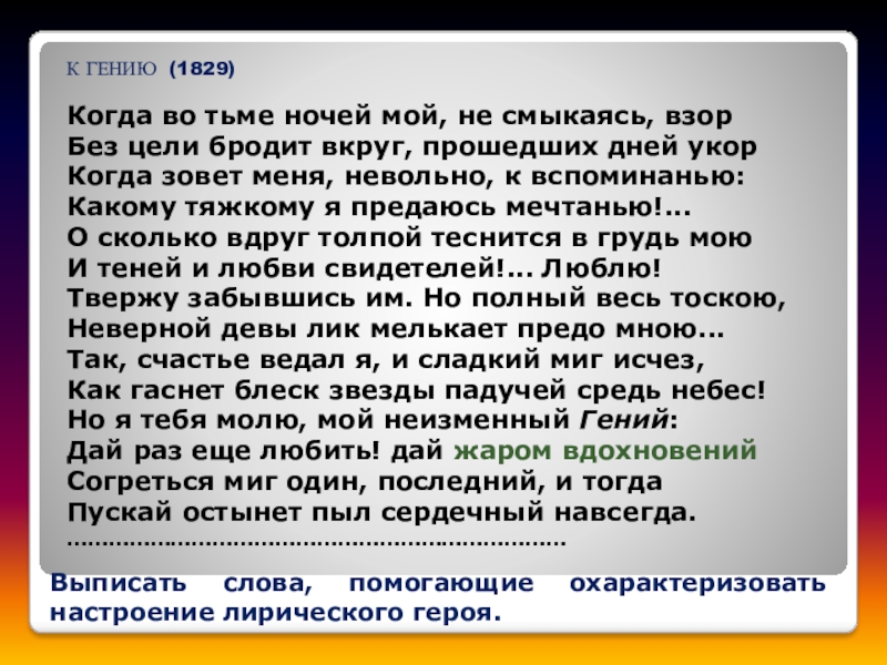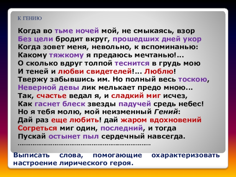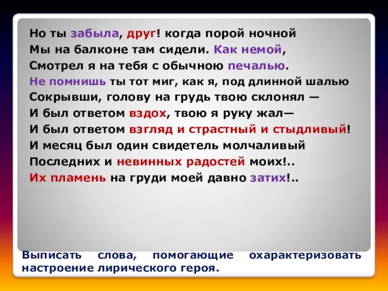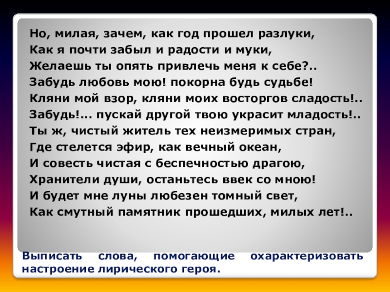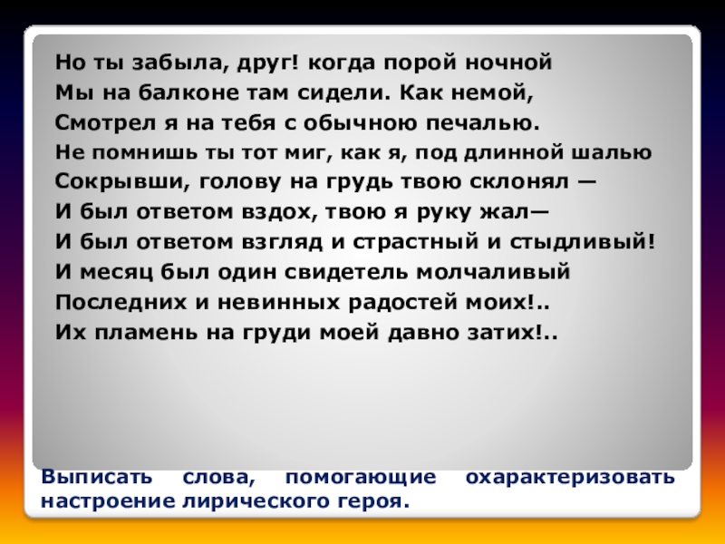 Слайд 8Выписать слова, помогающие охарактеризовать настроение лирического героя.
