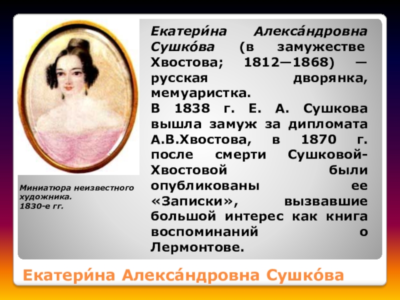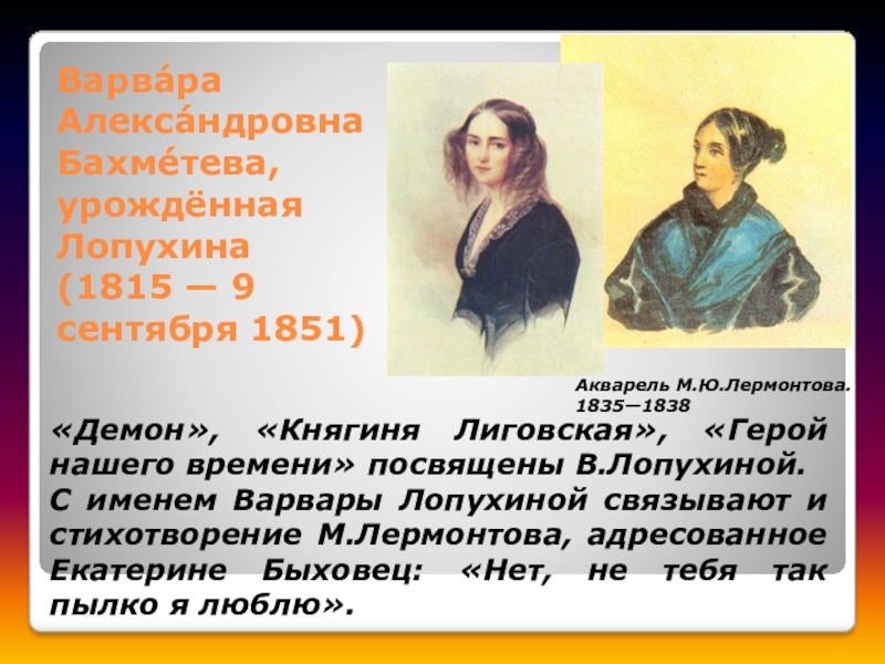 Слайд 1Адресаты любовной лирики М. Ю. Лермонтова