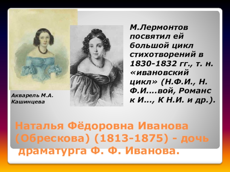 Слайд 14Наталья Фёдоровна Иванова (Обрескова) (1813-1875) - дочь