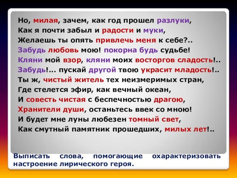 Слайд 5Выписать слова, помогающие охарактеризовать настроение лирического героя.