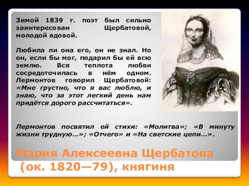 Любила ли она его, он не знал. Но он, если бы мог, подарил бы ей всю землю. Вся теплота любви сосредоточилась в нём одном. Лермонтов говорил Щербатовой: «Мне грустно, что я вас люблю, и знаю, что за этот легкий день нам придётся дорого рассчитаться».