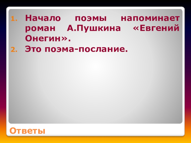 Начало поэмы напоминает роман А.Пушкина «Евгений Онегин».