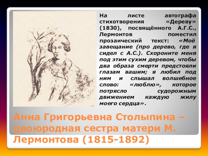 Слайд 11Анна Григорьевна Столыпина – двоюродная сестра матери М.Лермонтова (1815-1892)