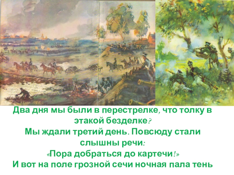 ждали третий день. Повсюду стали слышны речи: «Пора добраться до картечи!» И вот на поле грозной сечи ночная пала тень