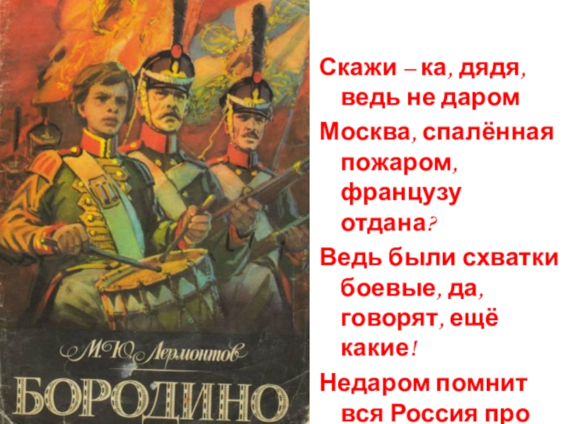 Скажи – ка, дядя, ведь не даромМосква, спалённая пожаром, французу отдана?Ведь были схватки боевые, да, говорят, ещё какие!Недаром помнит вся Россия про день Бородина!