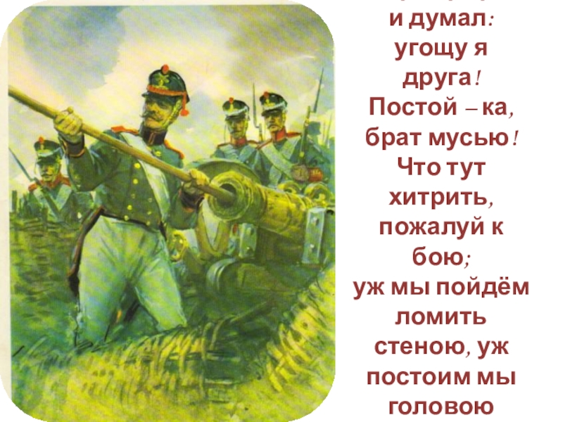 Забил заряд я в пушку туго и думал: угощу я друга! Постой – ка, брат мусью! Что