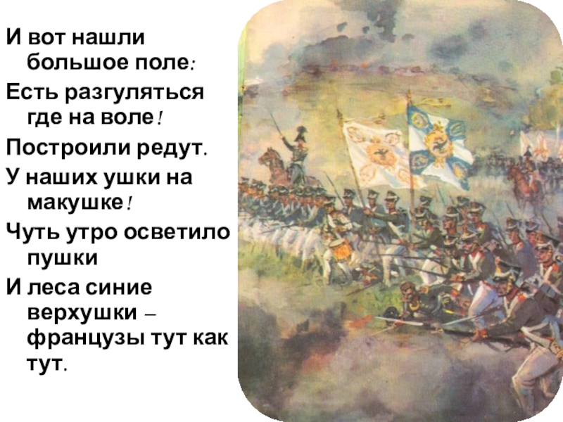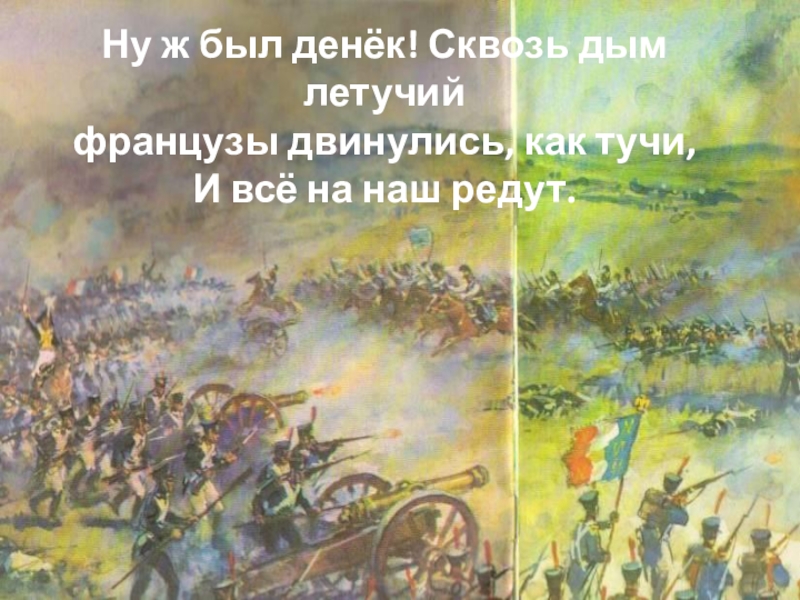 Слайд 12Ну ж был денёк! Сквозь дым летучий французы двинулись, как тучи, И